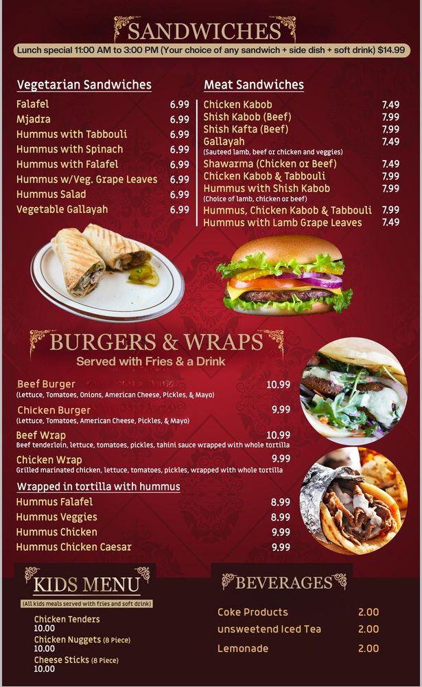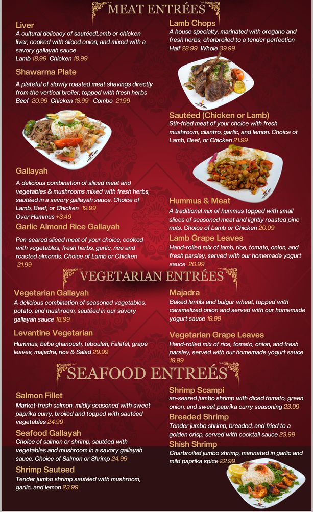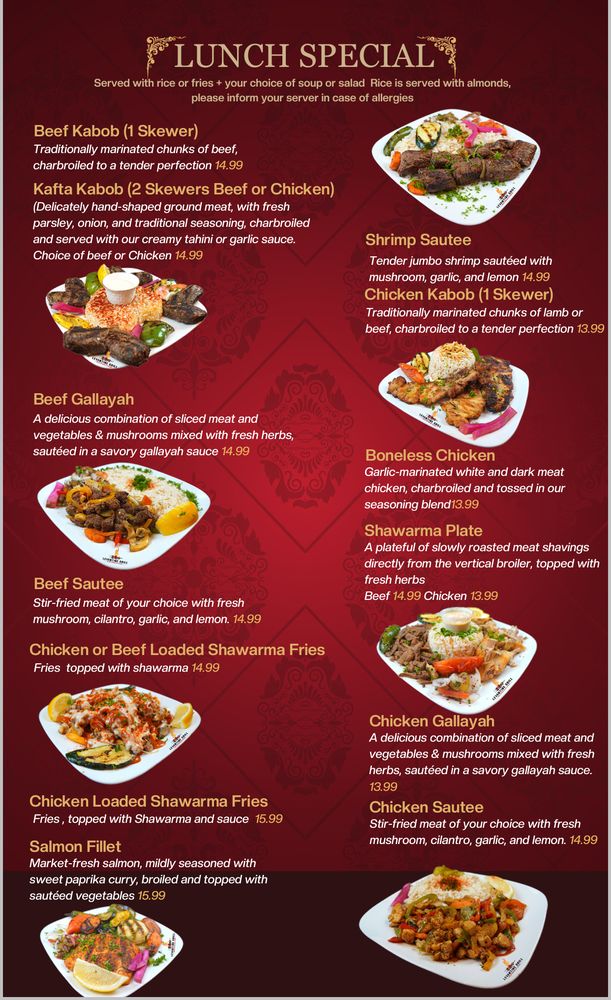 3 Skewers Chicken Kabob, 2 Skewers Shish Kabob, Chicken Gallayah, 3 Skewers of Shish Kofta, Shawarma Lamb Chicken, Salad Hummus.