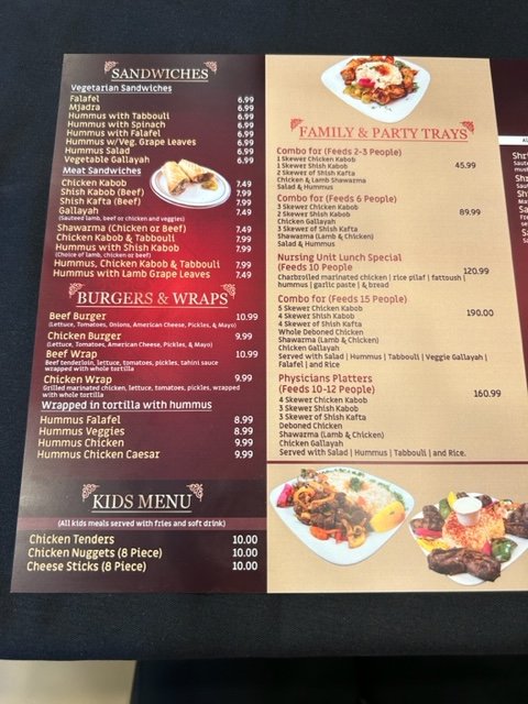 5 Skewer Chicken Kabob, 4 Skewer Shish Kabob, 4 Skewers of Shish Kafta, Whole Deboned Chicken, Shawarma Lamb Chicken, Chicken Gallayah. Served with Salad, Hummus, Tabbouli, Veggie Gallayah, Falafel, and Rice.