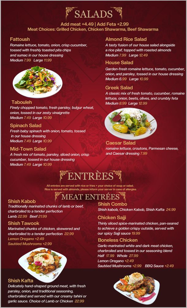4 Skewer Chicken Kabob, 3 Skewer Shish Kabob, 3 Skewer of Shish Kafta, Deboned Chicken, Shawarma Lamb Chicken, Chicken Gallayah. Served with Salad, Hummus, Tabbouli, and Rice.